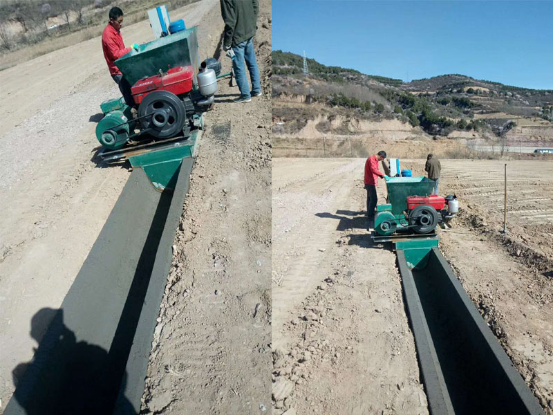 把機(jī)器放到挖好的溝模里面,啟動柴油機(jī),打開攪拌功能,啟動油泵,料斗上料。機(jī)器開始自動完成渠道成型機(jī)工作。因?yàn)槊總€(gè)地方的使用的水渠和沙子不同,第一次試機(jī)的時(shí)候成型都不會太美觀。如下圖。